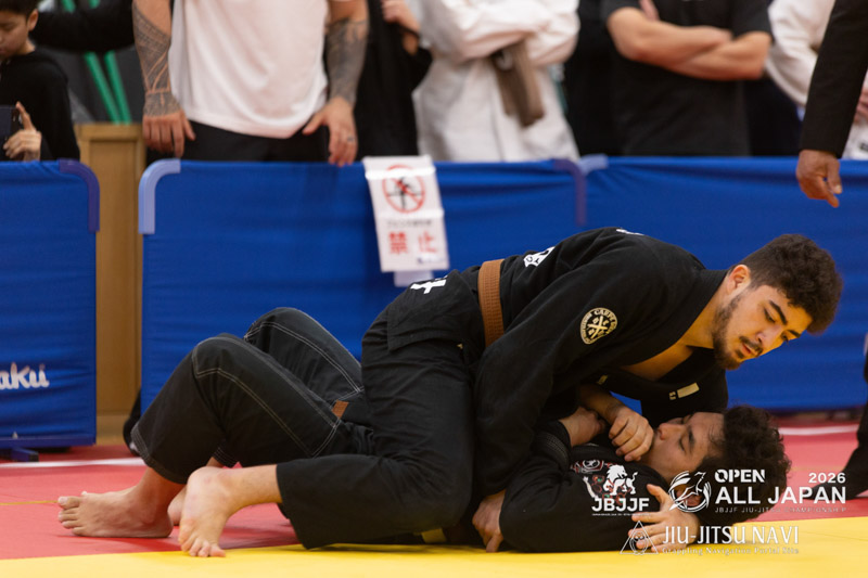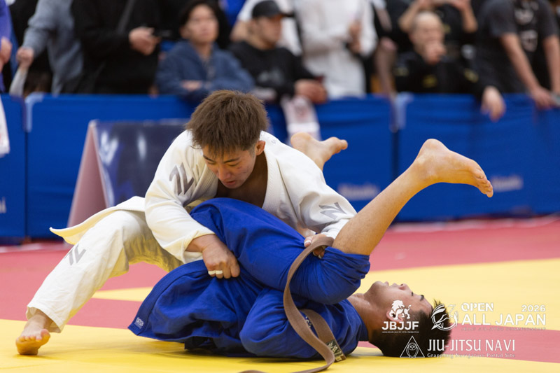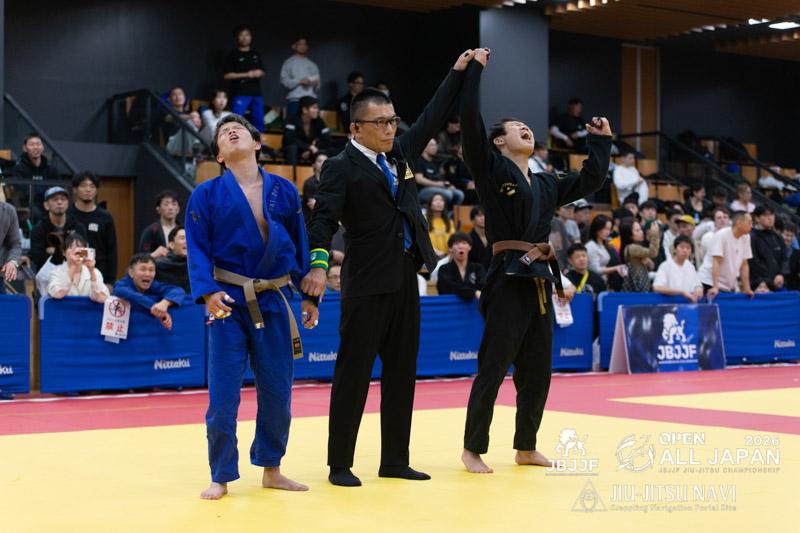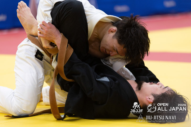 階級別ではアドバンテージ差で涙をのんだ下前が、17人がエントリーしたオープンクラスのトーナメントでも決勝に勝ち上がってきた。引き込んでボトムから攻め手を作ろうとする下前に対し、河合はパスガードを仕掛け、アバンテージを得る。アドバンテージ差のまま、試合が進行する。残り3分強となったところで、下前が足を担いできた河合の腕うまく取って回転し、そのまま腕十字の体勢へ。極め切った下前が勝利し、階級別の雪辱を果たした。