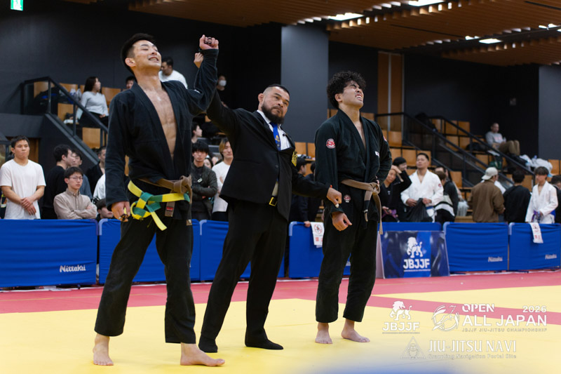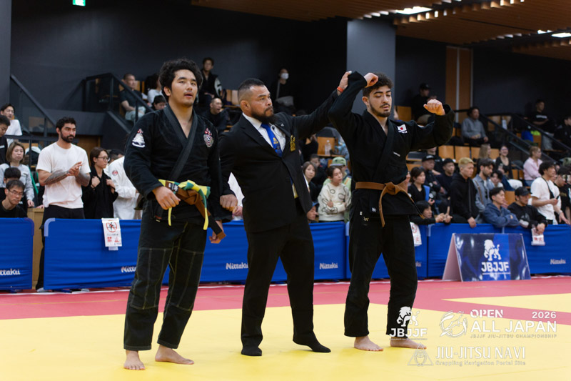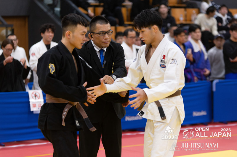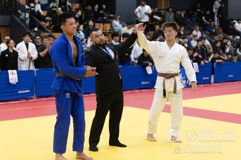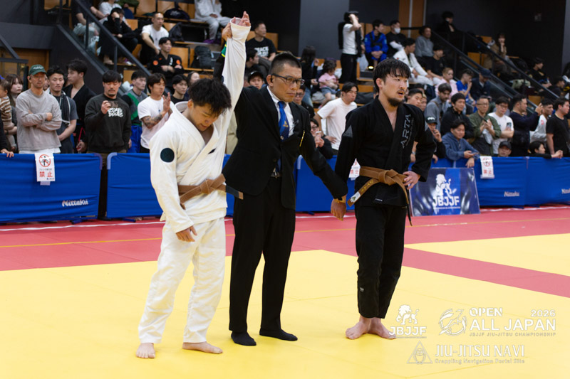 下前の引き込みに合わせて熊田がスイープポイントを得る。ボトムになった下前は長い手足を生かして、クローズガード、オープンガードと体勢を変えながら多彩に攻めていくが点数を得るには至らない。残り3分となったところで、立ちに戻り、引き込んだ下前がスイープに成功し、同点とする。しかし、全体を通して、パスガードや最後の最後で腕十字の動きを見せアドバンテージを得ていた熊田がアドバンテージ差で勝利を果たした。