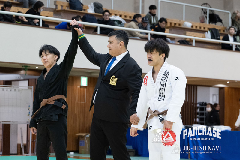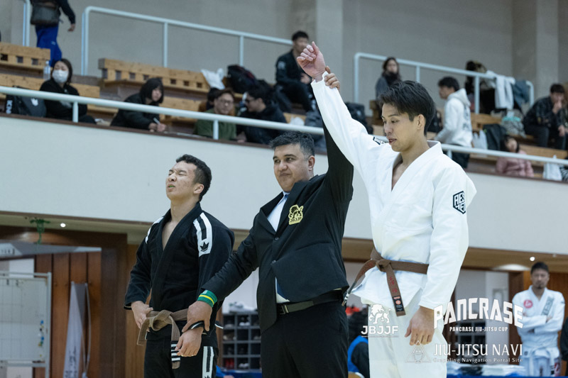 最初のダブルガードの攻防から大西がアドバンテージを得る。その後は野地のボトムからの足を使った仕掛けに対し、大西はトップから凌ぐ。残り2分を切ったところで、野地がしかけ、足を取りに行く。この攻防で野地がアドバンテージ3つを得る。大西も最後までパスガードを狙うなどして応戦するが、僅差で野地の勝利となった。